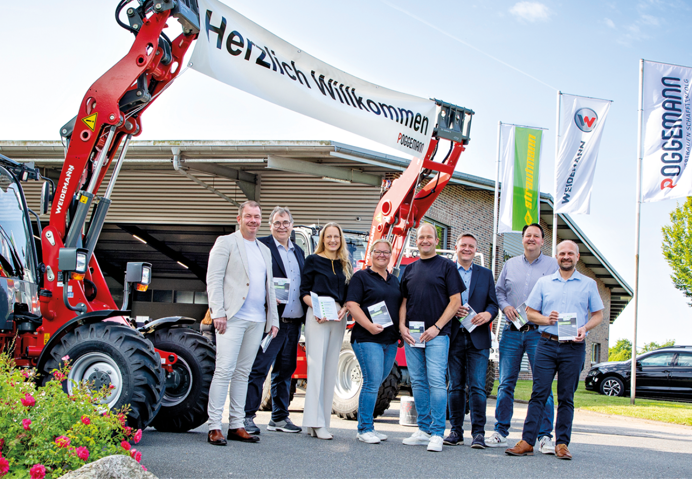 Eröffneten die Messe „Azubis werben Azubis“ in Bad Iburg bei strahlendem Sonnenschein (von links): Bastian Sommer, Hilter, Bürgermeister Torsten Dimek, Landrätin Anna Kebschull, die gastgebenden Unternehmer Sandra und Rainer Poggemann, sowie die Bürgermeister Daniel Große-Albers (Bad Iburg), Tobias Avermann (Bad Laer) und Eugen Görlitz (Dissen). Foto: MaßArbeit / Miriam Loeskow-Bücker